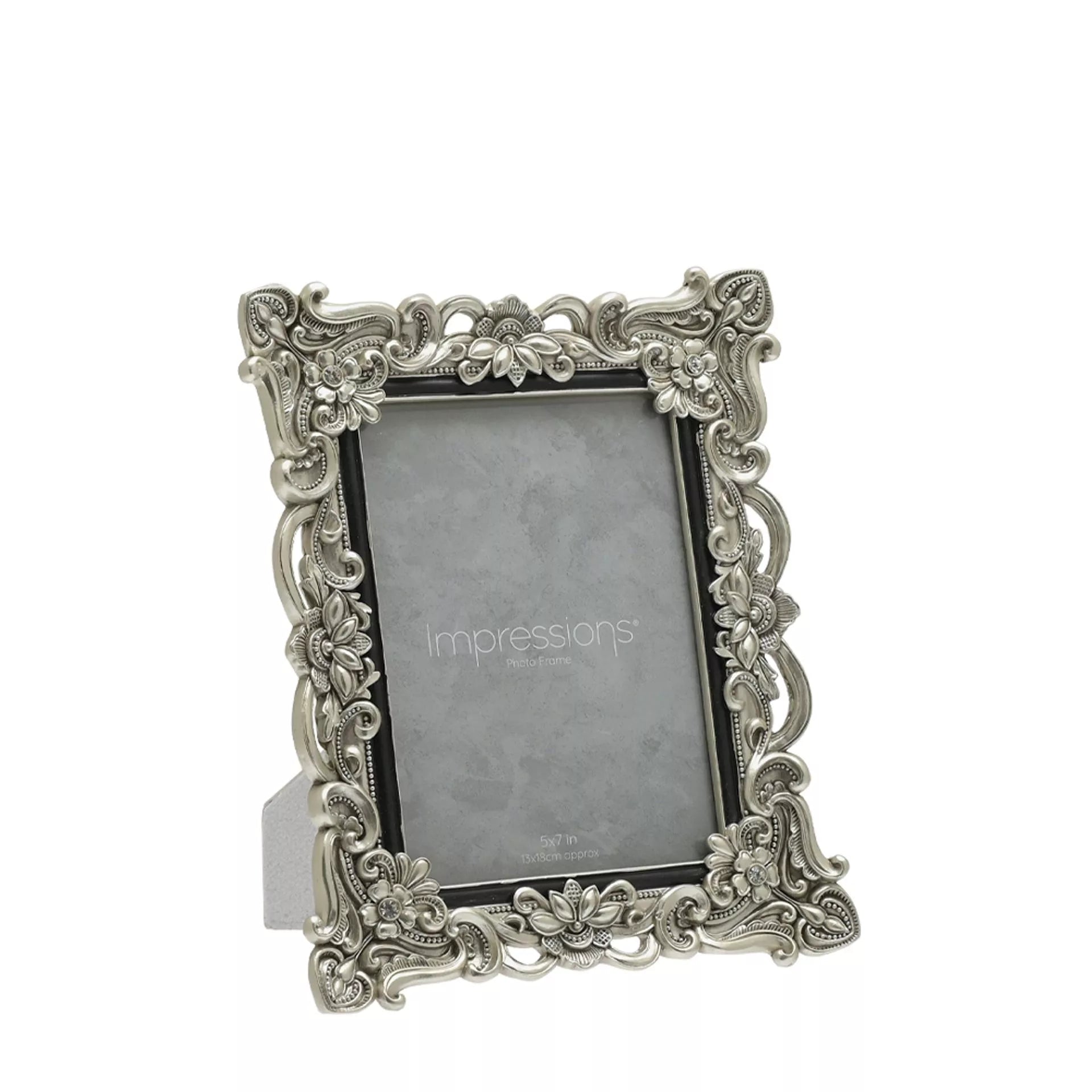This regally decorated frame adds an elegant touch to the home and gives treasured photographs the treatment they deserve. The resin frame showcases a silver metallic effect finish, antique floral design and crystal details, complete with luxury black velveteen standing strut. It is designed for portrait or landscape display.