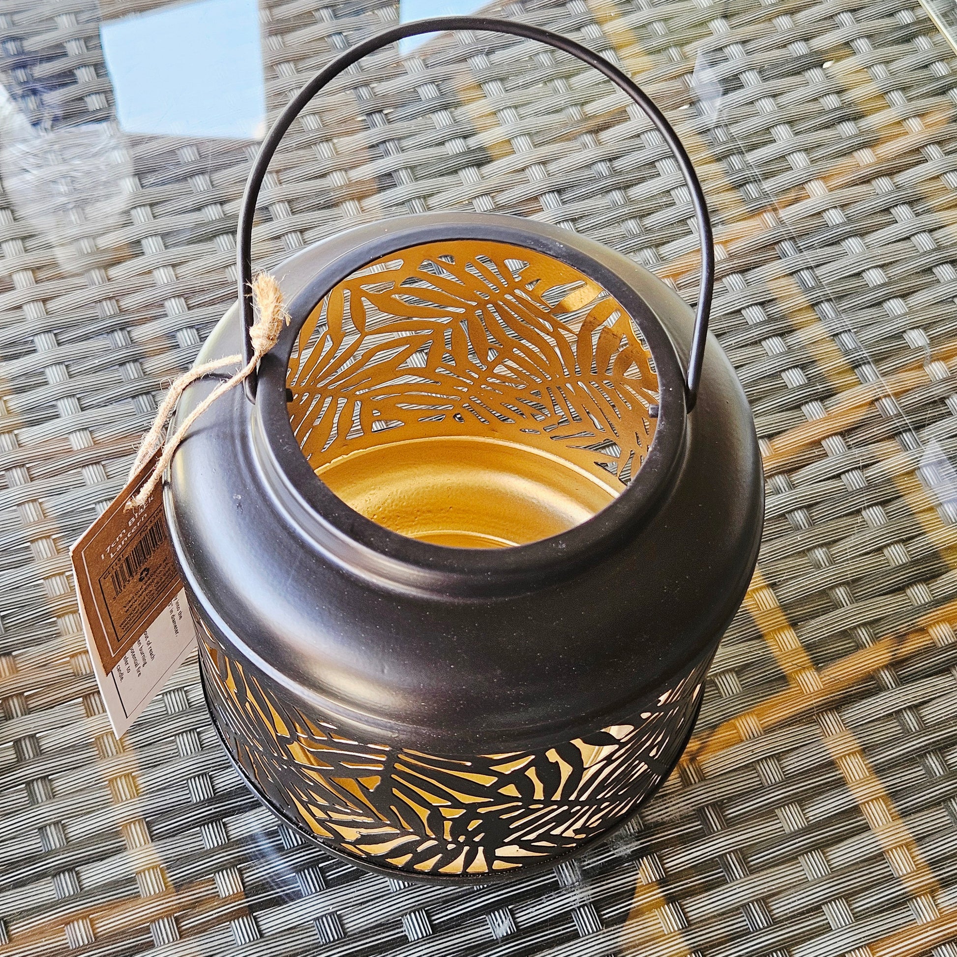 The exterior of this 17cm tall lantern features intricate leaf detailing, adding a natural element to its design. Designed to hold a candle, this lantern creates a captivating play of light and shadow, making it an ideal centrepiece or accent piece for both contemporary and traditional settings. Perfect to be placed on a tabletop or mantel.