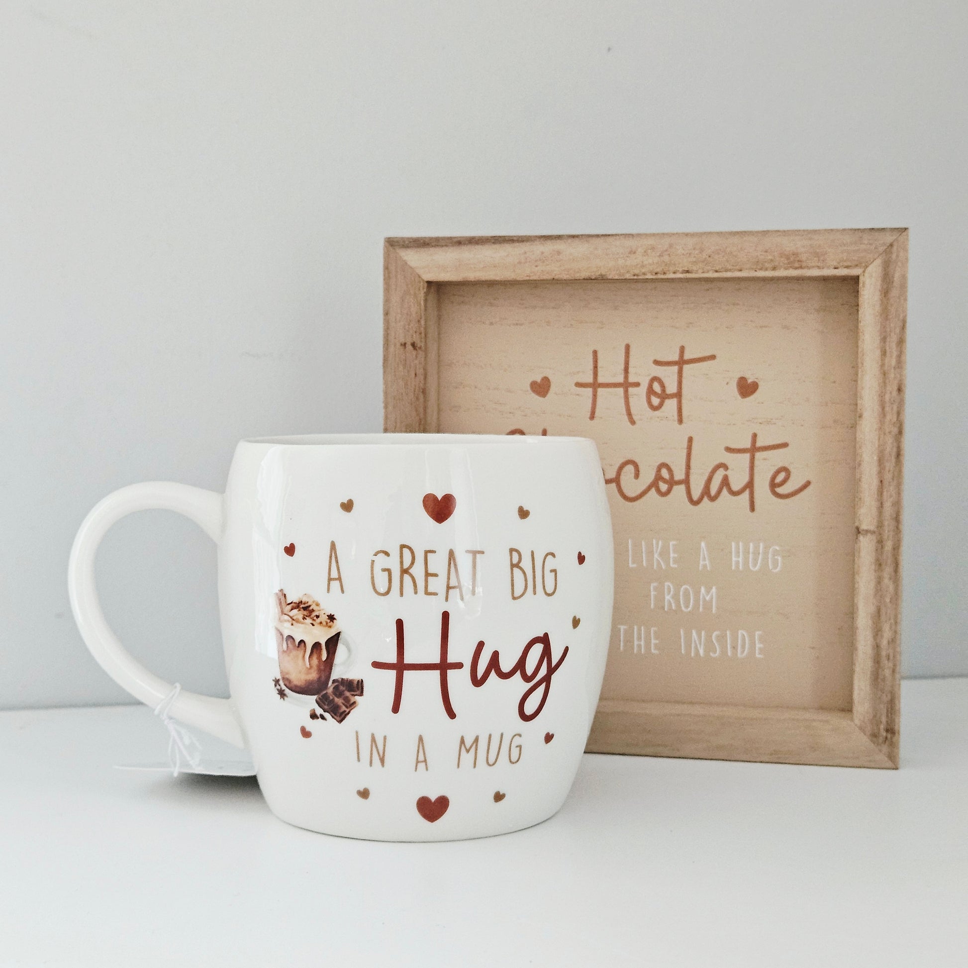 Cream-colored stoneware mug featuring red and brown text that reads "A GREAT BIG HUG IN A MUG" with small heart accents and a hot chocolate illustration. Rounded shape with a handle on the side.
