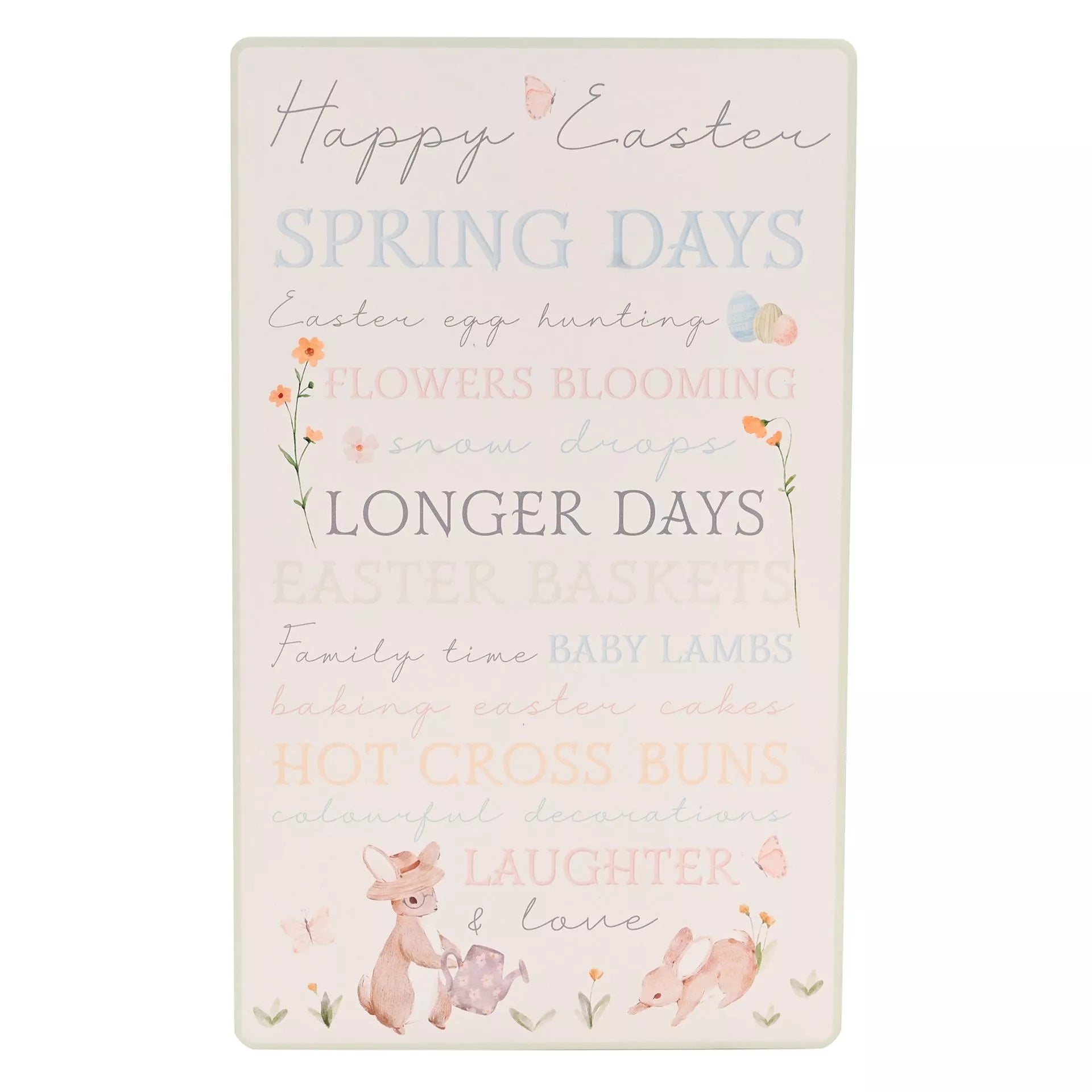 Easter Plaque features cheerful Easter lettering surrounded by illustrations of flowers, baby animals, and other spring motifs. Designed in soft seasonal colours, it’s a decorative piece that brings a light, playful look to shelves, walls, or tabletop displays.