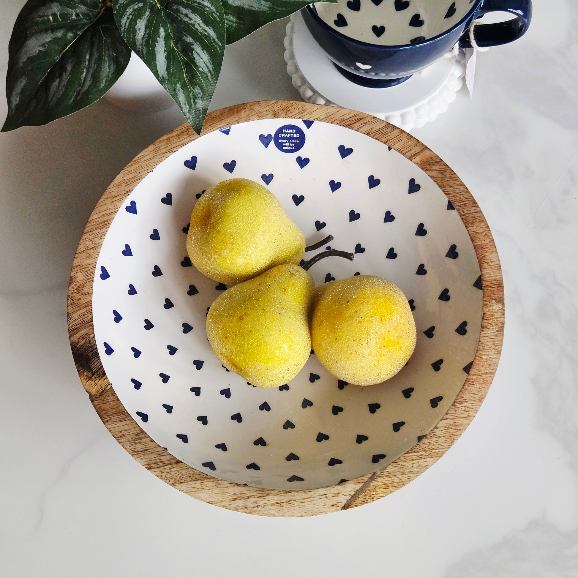 This charming Large Bowl, crafted from Mango Wood with an Enamel Heart Print, is a delightful addition to any table setting. Measuring 25 cm in diameter, this robust bowl combines the warm, organic appeal of mango wood with a whimsical enamel interior, adorned with a cascade of small blue hearts. Perfect for serving salads, or fruits, or as a decorative piece, it brings a touch of heartfelt charm and rustic elegance to your home décor. Ideal for everyday use or special occasions, it also makes a thoughtful gift for loved ones.