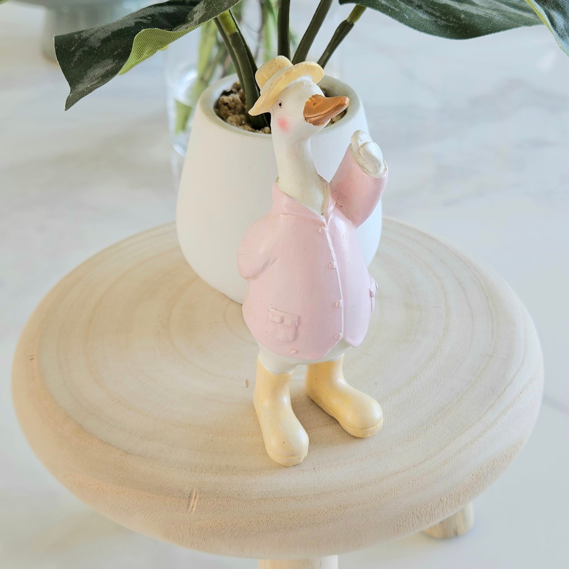 This quacking duck ornament wears a pastel pink raincoat and bright yellow wellingtons.