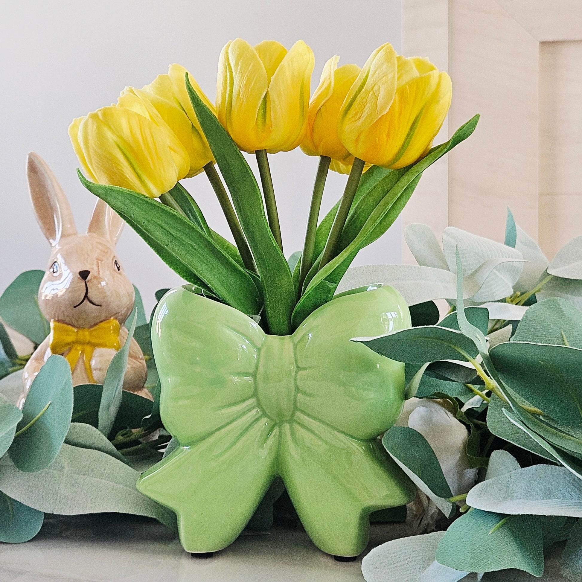 This charming set features five beautifully crafted tulips arranged in a stylish dolomite bow-shaped vase.